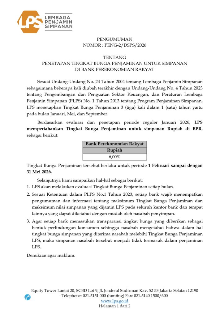 Sesuai dengan pengumuman nomor : PENG-2/DSPS/2026 oleh Lembaga Penjaminan Simpanan (LPS) terkait Penetapan Tingkat Bunga untuk simpanan di Bank Perekonomian Rakyat (BPR), kami menginformasikan: